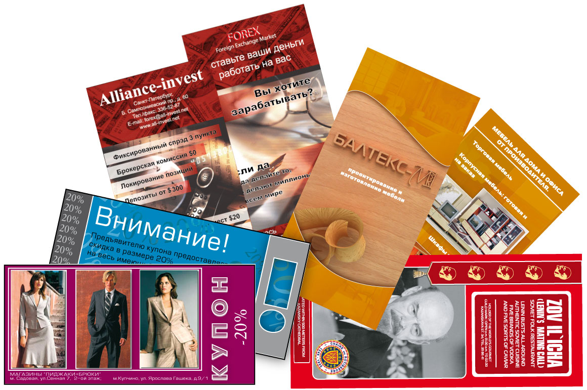 Листовки с рекламой эффективно работают вблизи торговых центров и других торговых точек. Их можно раздавать прохожим или заказать их рассылку по почтовым ящикам.